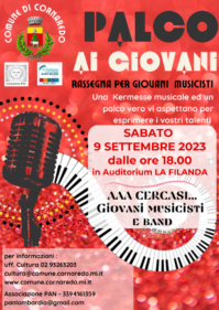 Il progetto, “Palco ai Giovani”, è dedicato ai giovani musicisti under 30 (solisti o gruppi) aperto ai vari generi musicali, dalla classica al jazz, pop, rock, rap, leggero, ecc che potranno esibirsi e farsi conoscere nel secondo weekend di settembre (9-10 settembre) davanti a un pubblico sul palco a Cornaredo.