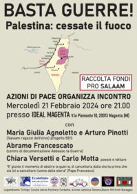 L’associazione “Azioni di pace” organizza un incontro pubblico per parlare della tragedia che si sta consumando in Palestina. L’appuntamento è per mercoledì 21 febbraio, alle 21, all’Ideal di Magenta, in viale Piemonte 10. Azioni di Pace è una rete formata da associazioni, gruppi e singoli del territorio dell’Ovest milanese. La serata è un’occasione per discutere e riflettere sui fatti accaduti a Gaza, e più in generale, su guerre e pace. Intervengono: